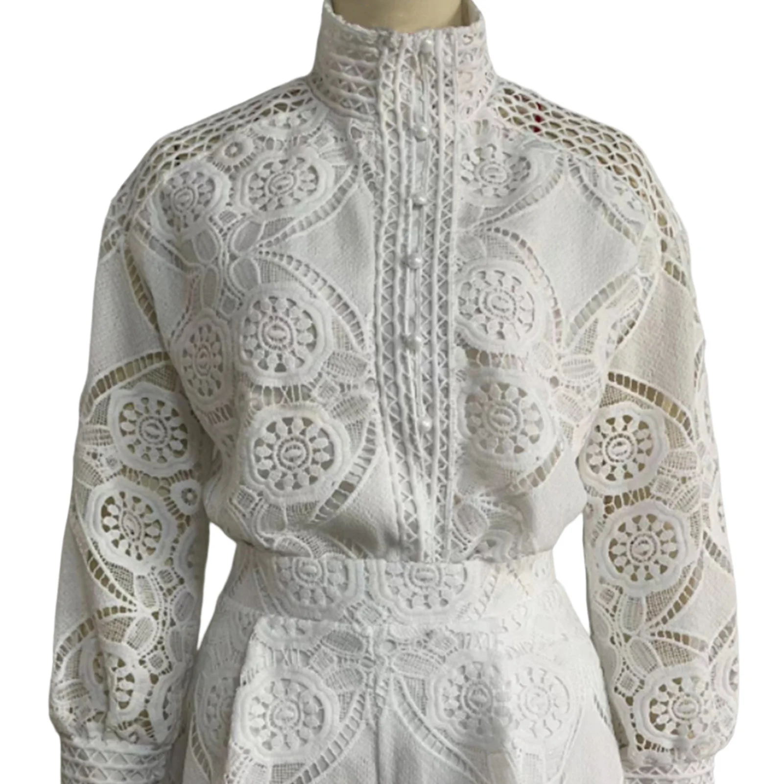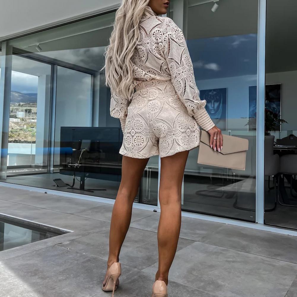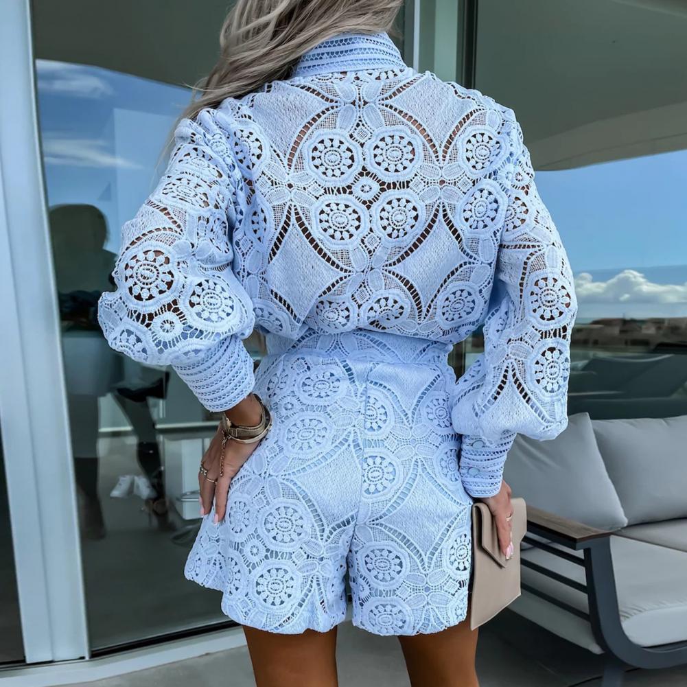 The Corinne set channels timeless vintage elegance with a fresh, modern twist. Featuring a delicate lace long-sleeve blouse and matching high-waisted shorts, it combines femininity and confidence in perfect harmony. The single-breasted design adds a touch of sophistication, making it ideal for spring gatherings, casual parties, or elevated summer days.